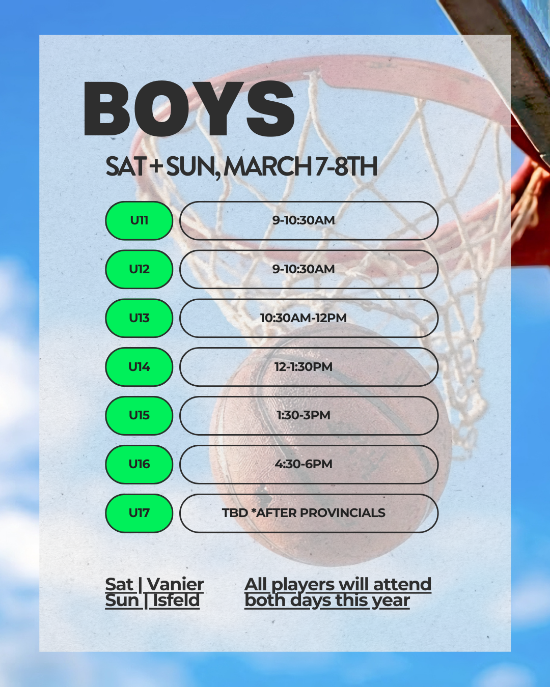 This year, everyone will do two sessions (Saturday + Sunday). U13 + U14 Girls - stay tuned for more info on your second session.
